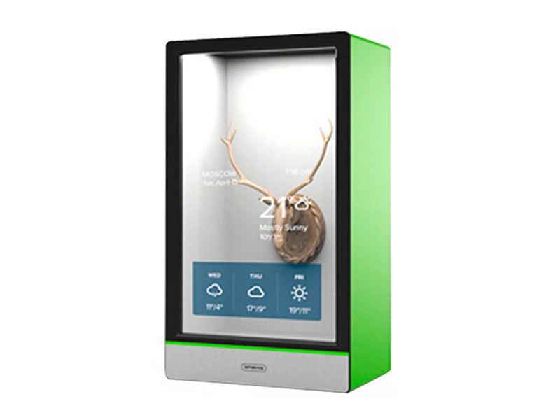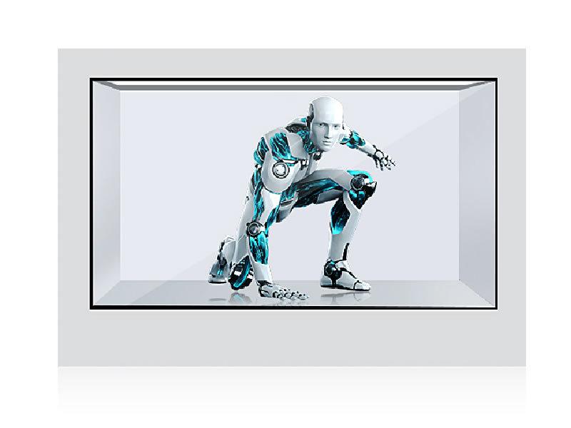 3D Transparants display standby state is a black screen, the state of power on is a transparent display, also similar to transparent glass, when the signal input can play video signals, pictures and music in perfect high definition; at the same time, it also can clearly see the items placed behind the display.